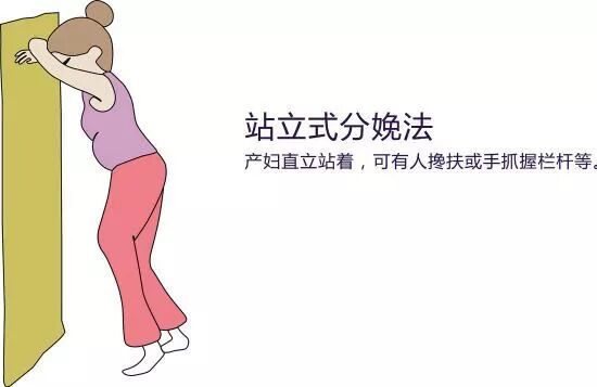 立式分娩包括走路,站立或者前倾等多种姿势。待产妈咪可以直立站着,用双手抱住丈夫的脖子或腰部,并靠在他身上或者步行;也可以抓握栏杆等支撑物。
