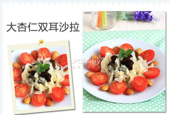 准备食材:杏仁10颗、银耳3朵、木耳(干)5朵、圣女果2个、枸杞子10粒、黑胡椒1/2茶匙、苹果醋1勺、粗盐1茶匙、蜂蜜少许、橄榄油3勺
