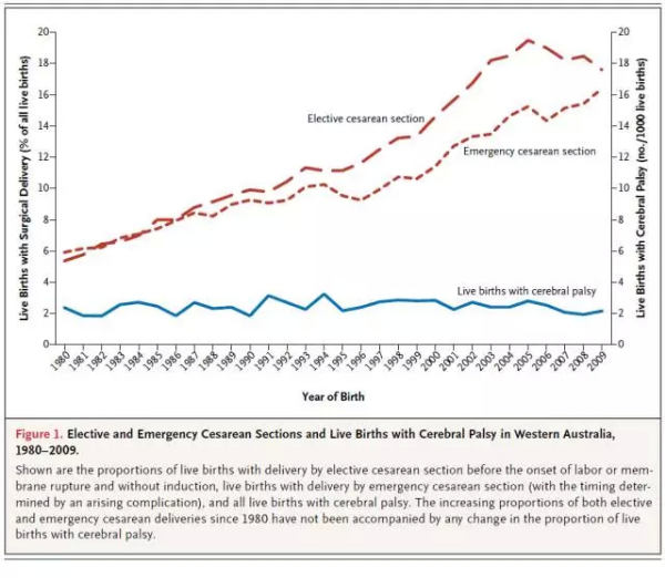 产程中连续胎心监护用于识别胎儿缺氧,期望能够及时干预缺氧以避免脑瘫。但不幸的是,这种期望总是令人失望。过去三十年中胎心监护造成了手术分娩的显著增加,伴随着相关风险和花费的增加,但是活产儿脑瘫的发生率并没有下降(参见图1)。