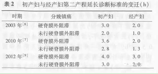 此研究打破了有关第二产程时限的"2 h 规则",奠定了现在广泛认可的第二产程"4-3-3-2"标准,即采用分娩镇痛(硬脊膜外阻滞)的初产妇 4 h,经产妇 3 h;未行分娩镇痛的初产妇 3 h,经产妇 2 h,见表2。2012 年,美国国家儿童健康和人类发育研究所 、美国母胎医学学会和美国妇产科医师学会联合推荐这一标准。