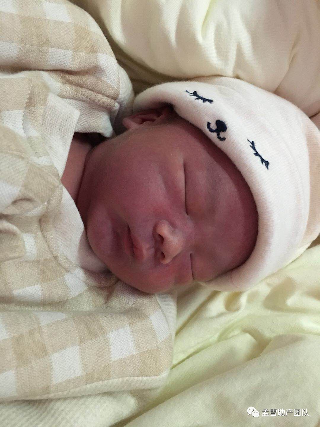 胎儿顺利分娩,羊水清澈,立马将胎儿放在腹部上进行皮肤接触,给予取暖,取侧卧位,呼吸好,心跳好,身体是粉色的,口唇红色,无紫绀,但是面部的皮肤似乎有皮下出血点,是紫色,很明显是是挤压后的表现,时不时地哭几下,声音尚可,只是明显力气不足。