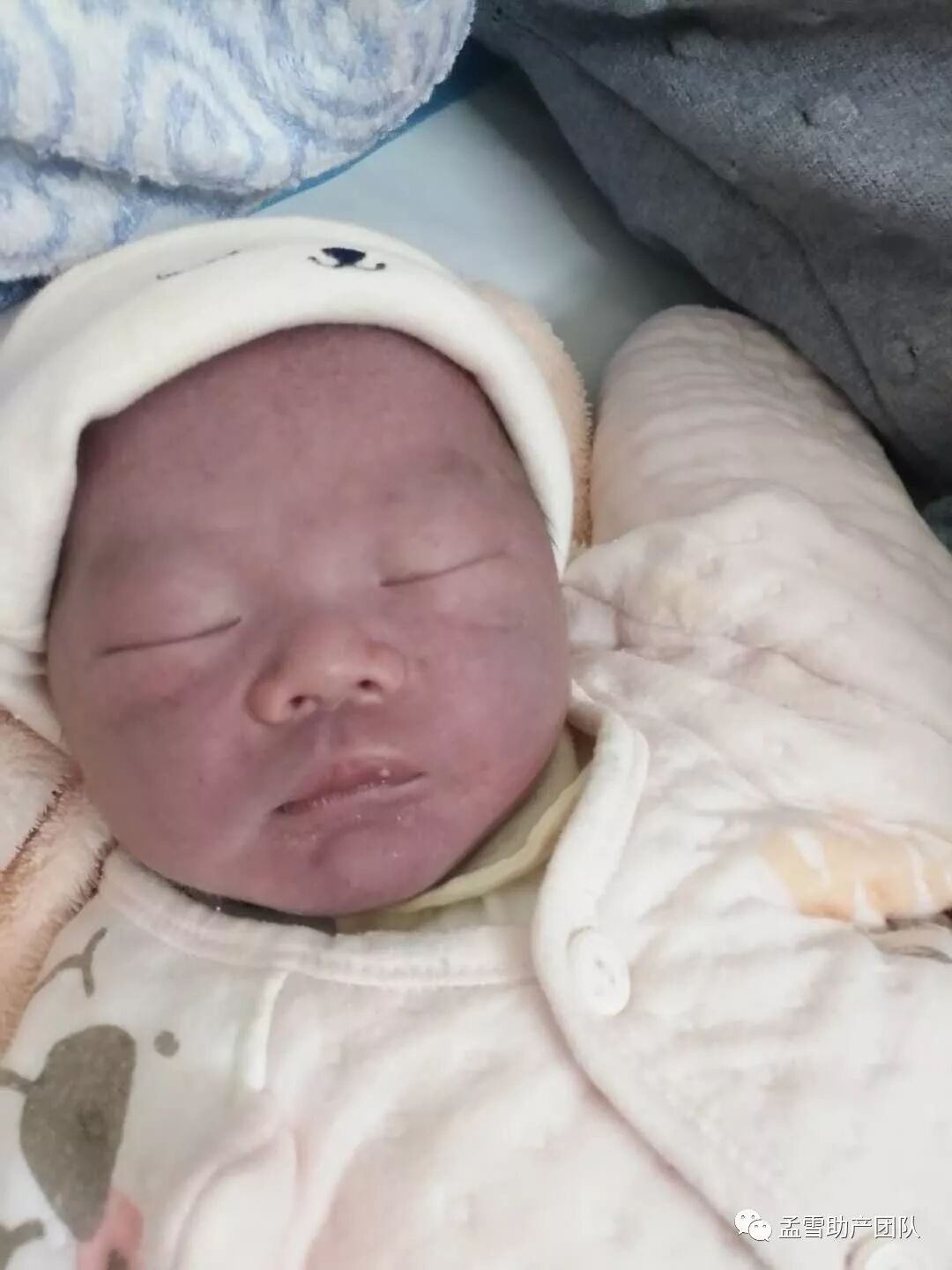 羊水清澈的宝宝,脸色紫色,身体粉色,口唇红色