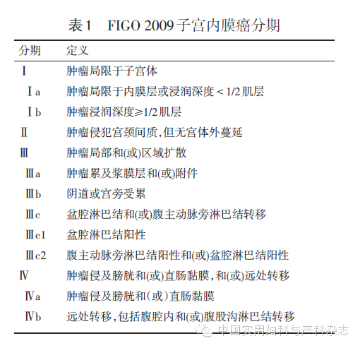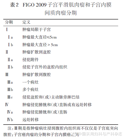 新版指南采用FIGO 2009子宫内膜癌和子宫肉瘤的分期标准见表1,表2。