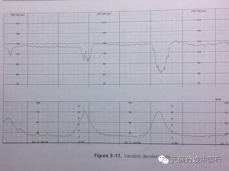 变异减速是突然发生的,从胎心开始减慢到最低胎心时间不超过30秒钟。心率减慢15次/每分钟以上,持续15秒钟以上,但不超过2分钟。其发生、程度和持续时间与宫缩没有一定关系。一般认为是由于脐带受压所致。↓↓↓