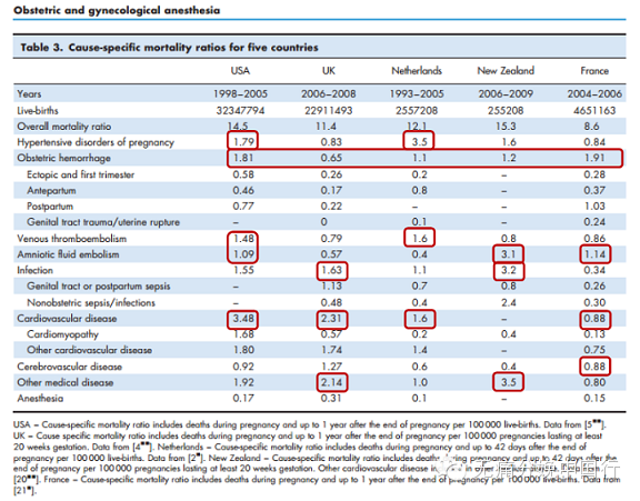 一份综合了美国,英国,荷兰,新西兰,法国的研究报告显示:从红框中看到的前三位各国的死亡原因中,出了羊水栓塞的预防有困难以外,妊娠高血压疾病,妊娠心肌病,产后出血,静脉血栓肺栓塞,感染等。都是可以预防的。