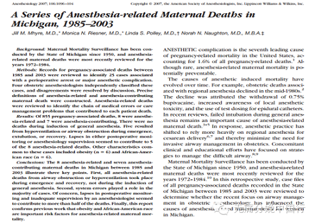 以往的研究中发现,麻醉引起的/相关的产妇死亡,大多由于产妇气道管理问题。困难插管,气管导管食管误插,通气不良,误吸等。2007年《麻醉学》上报告的1985年-2003年美国密歇根州15例和麻醉相关的或麻醉导致死亡的病例分析有了新发现: