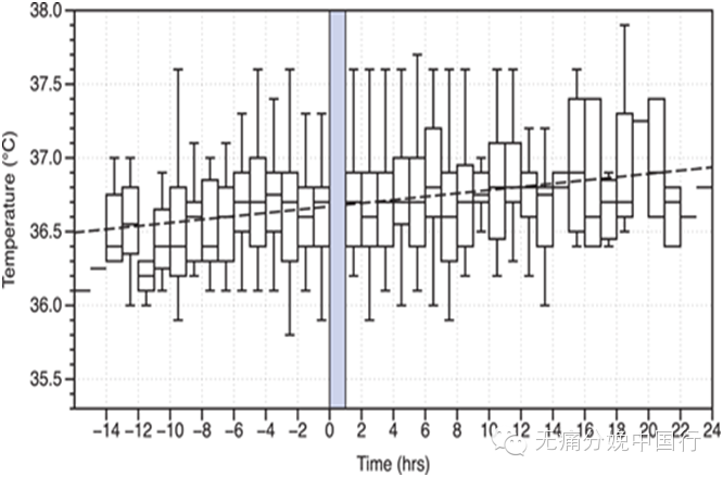 图:横坐标表示时间,0点表示硬膜外镇痛起始点。纵坐标表示体温。产妇每小时测得体温以长方形表示。由于产程长短不一,产妇数在横坐标两头的观察点(矩形变短)减少。小方框内的横杠和上下纵向杠分别表示中位数和25-75%区间。横贯的虚线表示温度升高趋势。