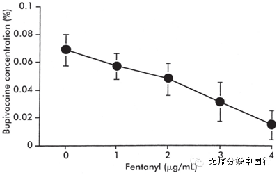 此外,合用还加快起效速度,增加作用时间(几乎增加一倍),改善镇痛质量。有一项布比卡因合用芬太尼的研究,硬膜外加入100微克芬太尼的病人对镇痛非常满意的,是没有合用的7倍(43%比6%)。鉴于这些研究,合用阿片类药物降低局麻药的剂量。
