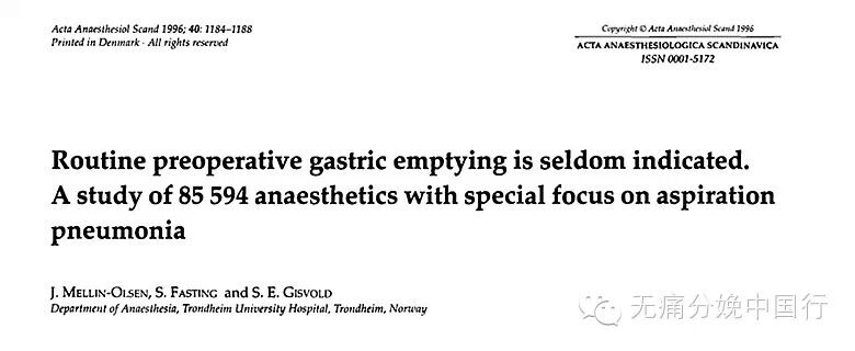 还必须清楚地认识到,我们在解读西方国家的文献时,还有个时代性问题。请看下面第五版Chestnut产科麻醉学上最后结论段写道:"Maternal death from Mendelson‘s syndrome is now extremely rare, and its decline probably owes more to the widespread use of neuraxial anesthesia than to NPO poli?cies. Rigid NPO policies are therefore no longer appropriate on the labor and delivery unit, and women should be allowed to alleviate thirst during labor by consuming ice chips and clear fluids"