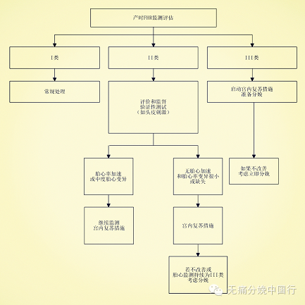 2008 年美国儿童健康和人类发育研究所修订的解读胎儿心率模式指南启用了一个三层解译系统。I类胎心率模式:能很确定地预测胎儿的正常酸碱状态,属于"正常"。 III类胎心率模式:预示着异常胎儿酸碱状态,属于"不正常"。中间的II类胎儿心率模式包括那些不能被列为I类或III类的中间类型。这个机构建议I类 不需任何形式的临床干预,但支持迅速评估III类胎心率模式的产妇。尽管希望通过有效的临床干预解决异常III类胎心率模式,这可能有助于避免不必要的剖 宫产,但在这些努力不奏效的情况下,建议尽快结束分娩(图 1)。中间的II类胎心率模式需要高度关注,但并不需要立刻结束分娩,建议评估、持续监测和再评估。通过调整改善子宫胎盘灌注(如调整催产素滴注速度、给 予产妇吸氧、改变产妇体、治疗产妇低血压)可能会让其转变成I类胎心率模式。